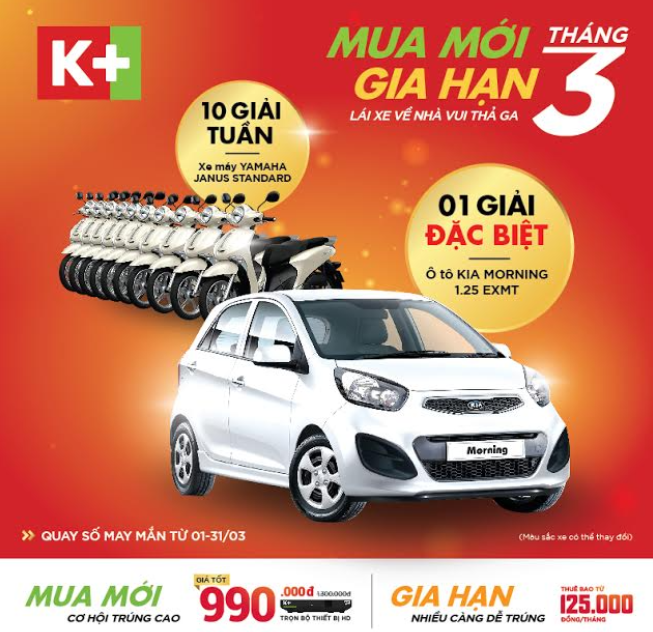 Tất cả khách hàng đăng ký lắp đặt K+ mới hoặc gia hạn thuê bao K+ trong tháng 3/2018 sẽ nhận được mã dự thưởng tham gia chương trình quay số may mắn với giải thưởng là 10 xe máy Yamaha Janus Standard và 01 xe ô tô 4 chỗ Kia Morning 1.25 EXMT. Chương trình được áp dụng trên toàn quốc với tổng giá trị giải thưởng hơn 560 triệu đồng nhằm tri ân khách hàng đã tin tưởng lựa chọn K+ để thưởng thức các chương trình giải trí, thể thao và phim ảnh chất lượng cao, cụ thể như sau: