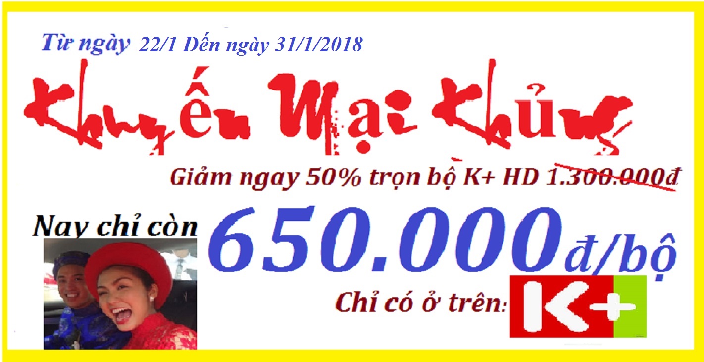 Giảm ngay 50% giá trọn bộ đầu thu K+ HD nay chỉ còn 650.000đ khi đăng ký bộ K+HD mới .Thời gian từ 22/01 đến 31/01/2018 Áp dụng từng khu vực